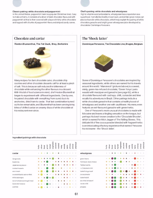 - کتاب همچنین به ویژگیهای کلیدی مواد غذایی، پروفایلهای عطر، غذاهای کلاسیک، ترکیبهای معاصر، توضیحات علمی، ویژگیهای خاص و مشارکت برخی از بهترین سرآشپزهای جهان برای ۱۵۰ مادهی اولیهی اصلی، و موارد بسیار دیگری میپردازد.
