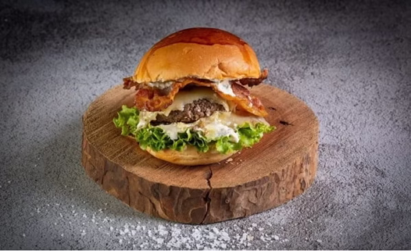 - برگر با پیاز کاراملی، پنیر بز و گوجه خشک