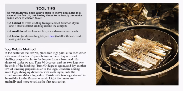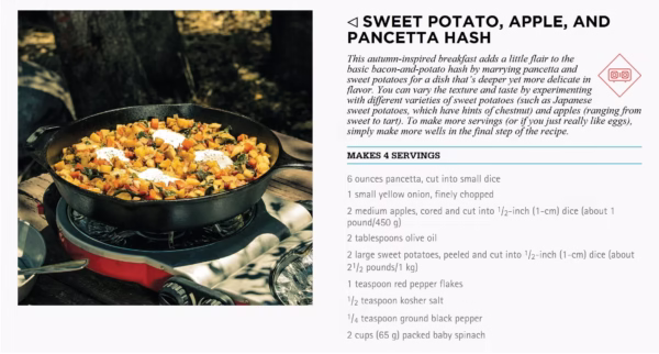 این فصل توصیههای سازمانی و تکنیکهای آشپزی را ارائه میکند، مانند برنامهریزی وعدههای غذایی، بستهبندی کوله، و انبار کردن انباری در کمپ. همچنین نحوه ایجاد آتش، استفاده از کباب پز و حفظ گرما در اجاق هلندی را توضیح می دهد. در فصل بعدی دستور العمل های صبحانه، مانند هش ماهیتابه آتش، موز سرخ شده، و داچ بیبی با انواع توت ها ارائه می شود. دستور پخت آسان است و از مواد تازه برای شروع درست روز استفاده می شود.