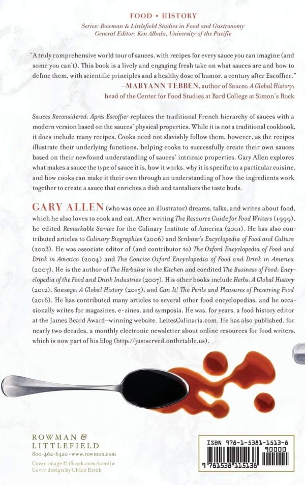 کتاب سس های تجدید نظر شده یک کتاب سنتی نیست ولی بی شک یک کتاب اصیل است. Sauces Reconsidered Après Escoffier کتابی درباره خواص ذاتی سس ها است. که درک شما از جهان بی انتهای این جز جدا ناپذیر از غذا را تغییر میدهند. (Rowman & Littlefield Studies in Food and Gastronomy)